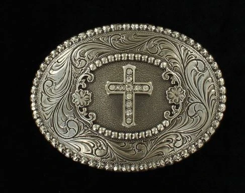 Add a distinctive accent to your favorite belt with this distinct buckle. Antiqued finish with intricately detailed scroll background. Center cross is accented with rhinestones. A perfect way to display your faith. Measures approx 3 x 4.