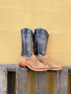 Lots of comfort in these Ariat LIL’ STOMPERS infant boots by M&F Western Products. Tan with a light blue shaft. Gold, blue and white wing pattern stitching. Velcro closure and rubber pads on soles. Super comfy for all day wear.