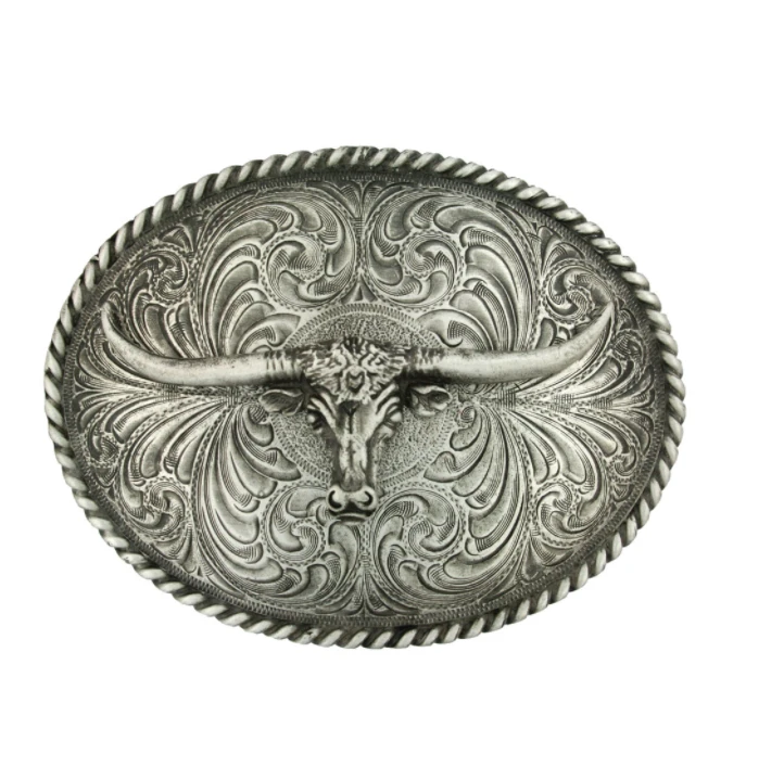 In this oval shape classic antiqued silver-tone Attitude belt buckle, a longhorn steer head relief figure with a horns curved upward is set on a background of sweeping filigree engraving. No picture can do justice to the beautiful shine and brilliance brought out by the dark antiquing. Twisted rope trim. Standard 1.5 inch belt swivel.