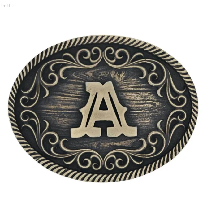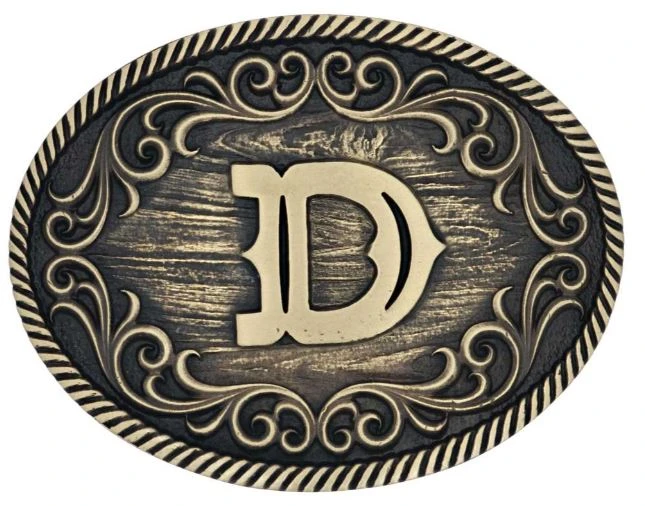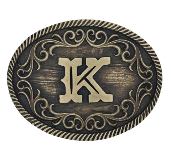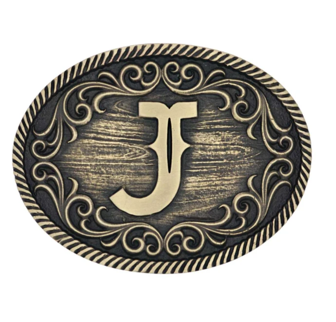 It’s an Attitude buckle at its personalized best. A cast antiqued two toned oval buckle with a center of rose gold highlighting the silver finished initial in its center. The rose gold center is framed by pinpoints with curving scrollwork design contrasting the structured frame. An outer edge of large antiqued silver finished pinpoints finishes the design. Standard 1.5 inch belt swivel.