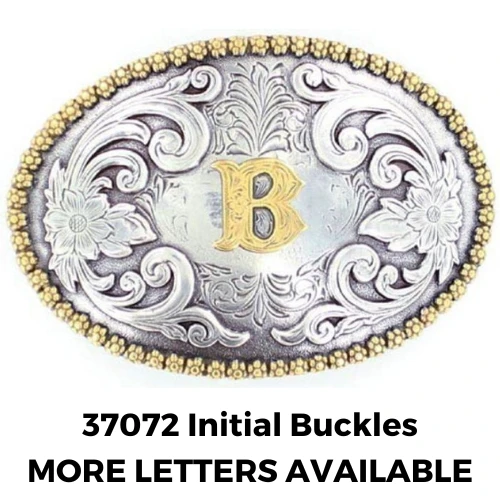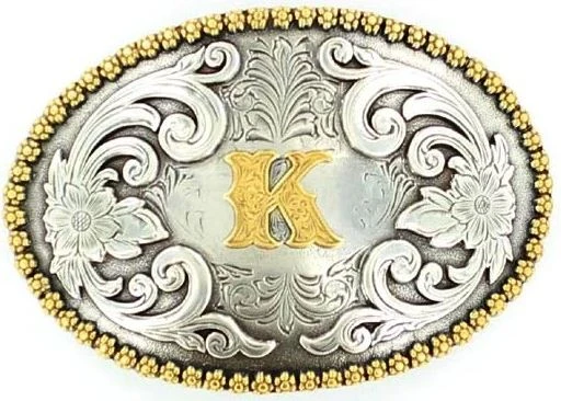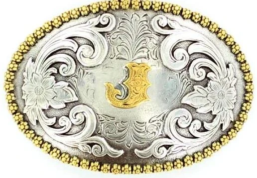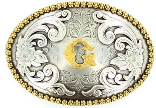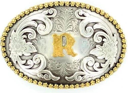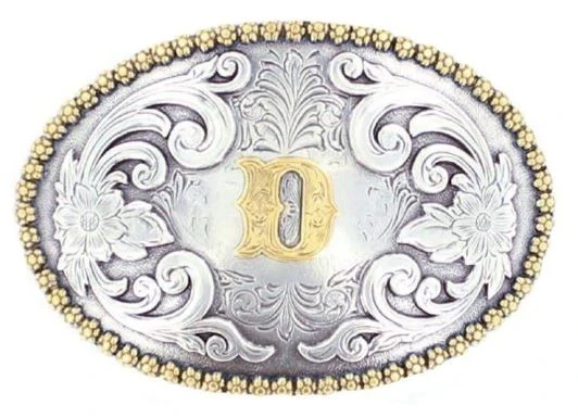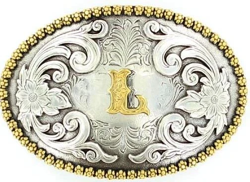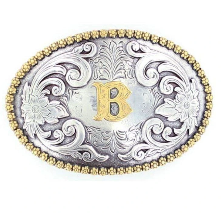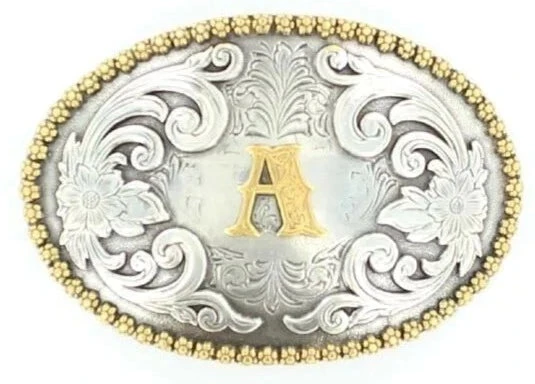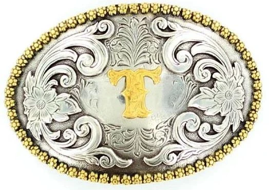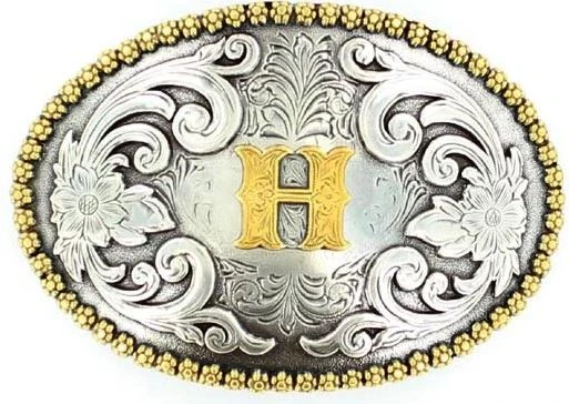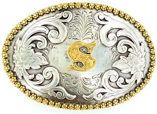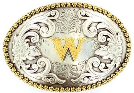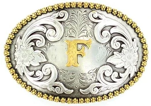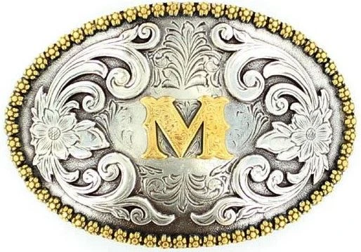 Nocona mens western buckle by M&F Western Products features an antique silver oval shaped buckle with an antique gold berry edge accented with an antique gold initial in the center. Available in letters: A-H, J-N, P, R-T & W. Measures: 2-3/4 X 4.