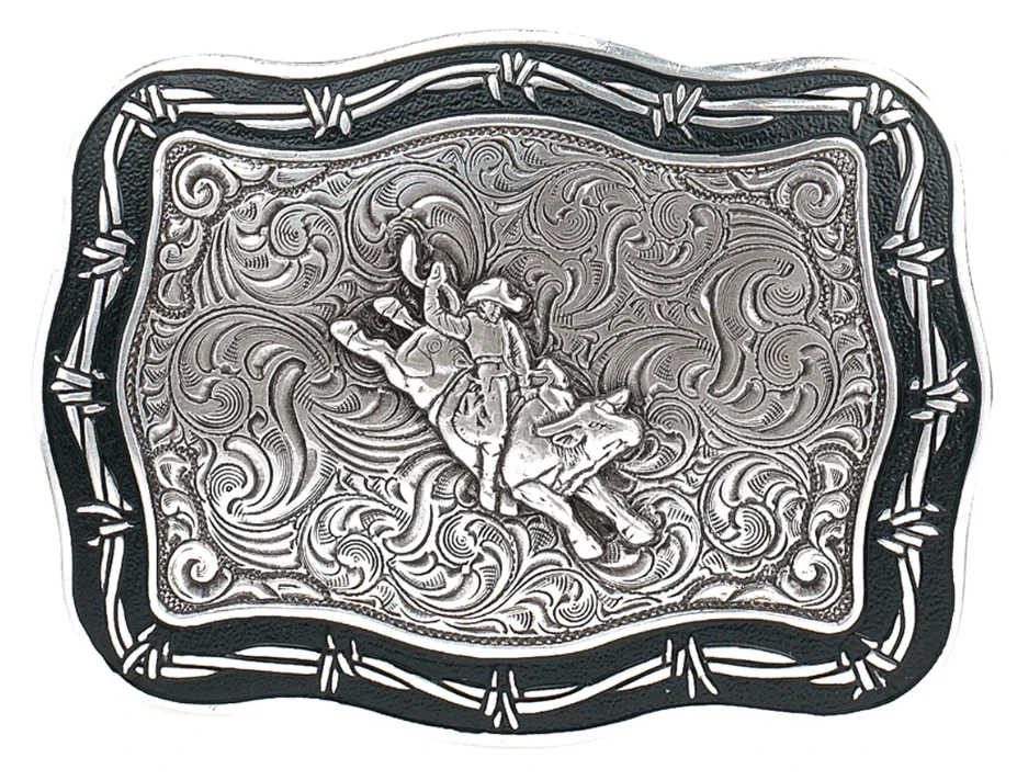 Barbed wire edging, scroll design background and a bull rider combine to give this Crumrine buckle a very unique and vintage look. This buckle will look great with your favorite pair of jeans or dress pants. Measures 3-1/4 x 4-3/4.