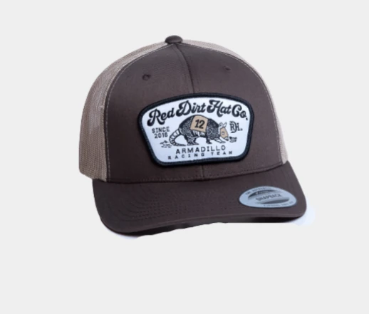 Brown and tan style snapback cap featuring the Red Dirt Hat Co. original “Dos Armadillos” patch.