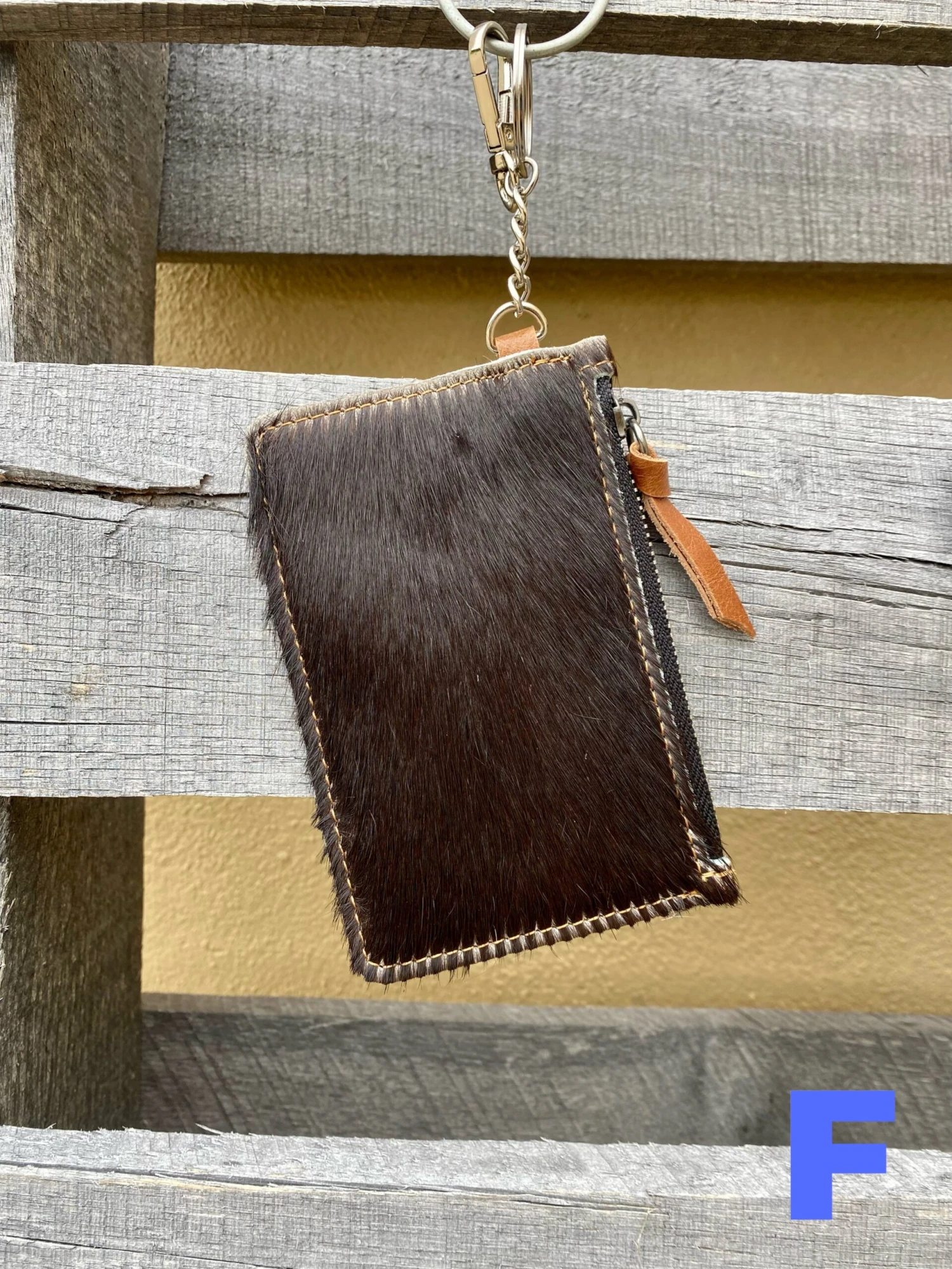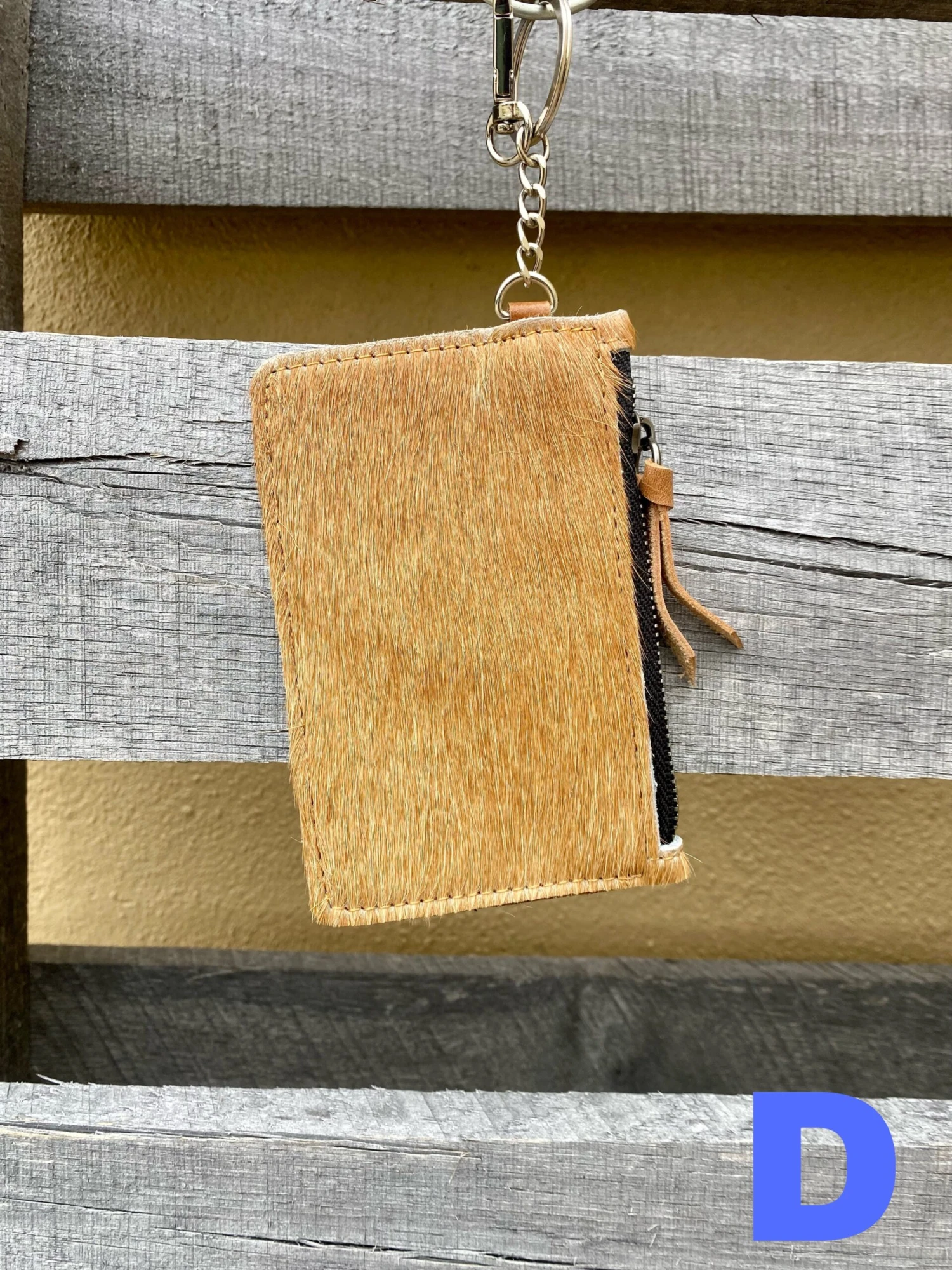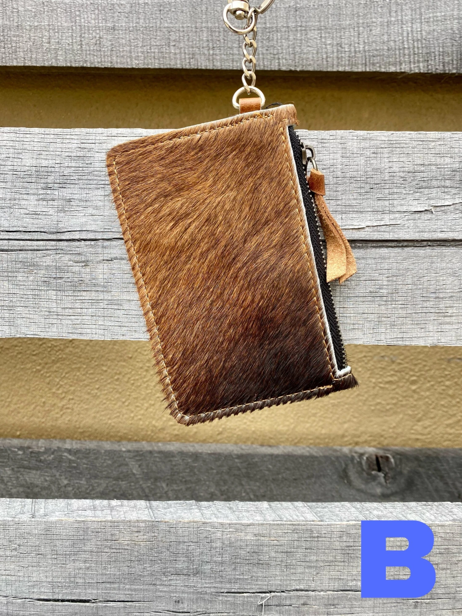 These fur and leather wallets feature a zippered pocket and four credit card slots. They have a key ring and a hook for attachment. They are approximately five inches long by three inches high.