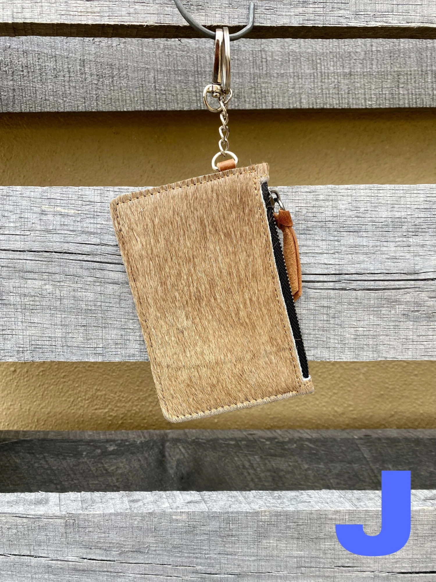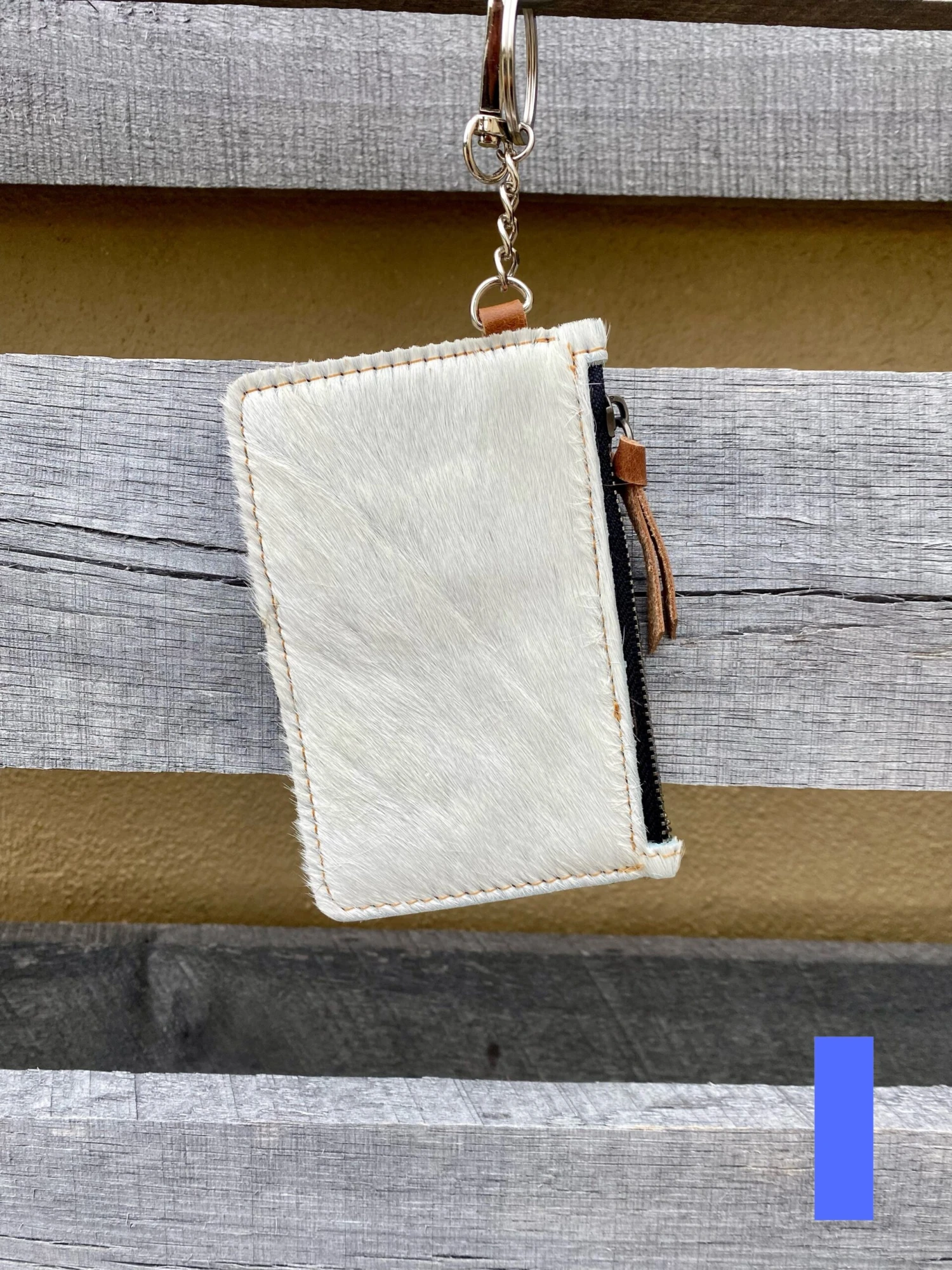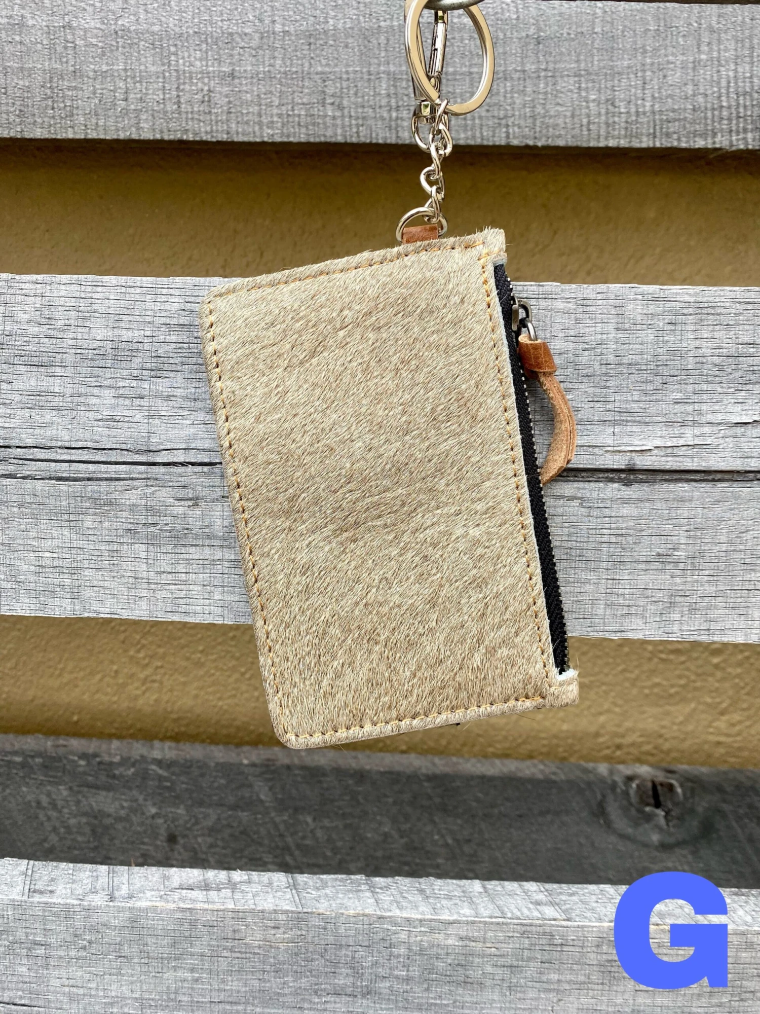 These fur and leather wallets feature a zippered pocket and four credit card slots. They have a key ring and a hook for attachment. They are approximately five inches long by three inches high.