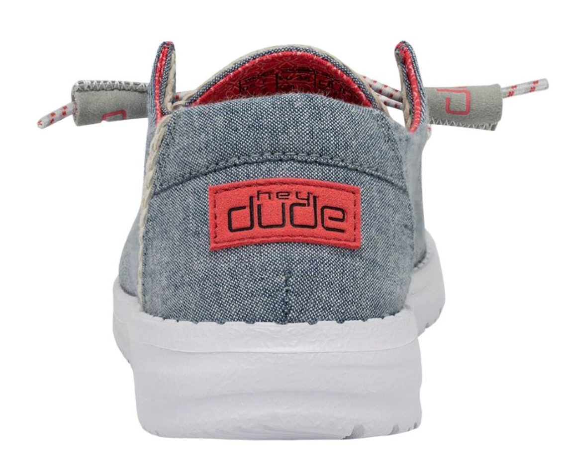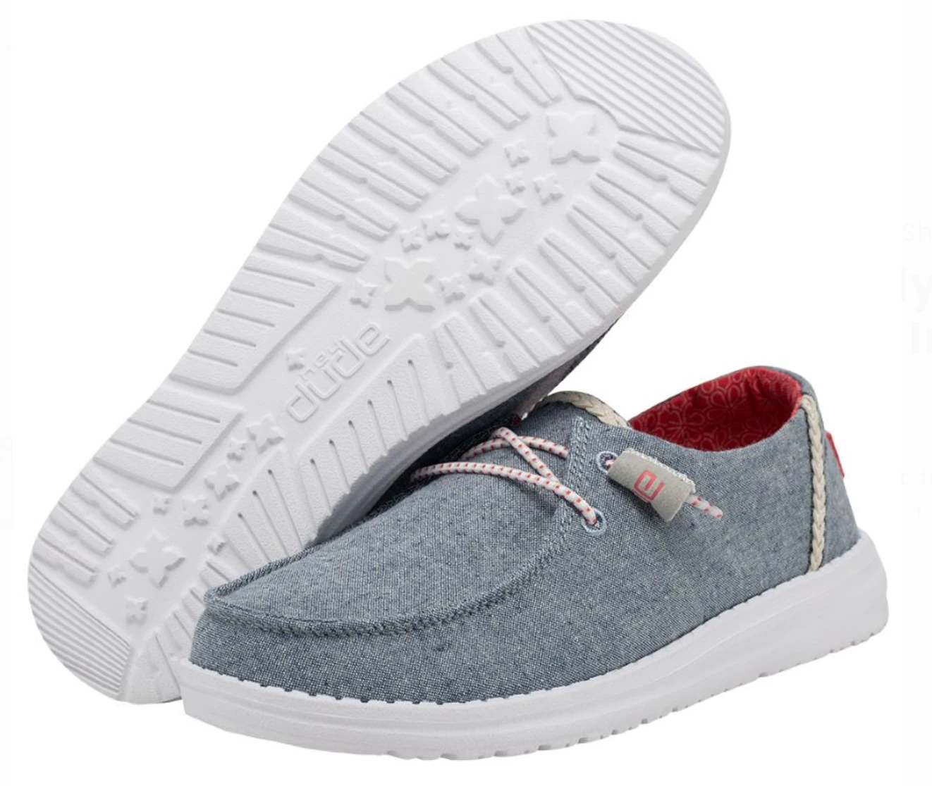 Our most popular moc meets soft chambray-cotton throughout. The Wendy Chambray collection embodies the Hey Dude lifestyle by combining our passion for comfort, quality, and sustainability. An easy-on elastic lacing system and an ultralight EVA outsole for extra comfort. This design is perfect for all day wear.Â