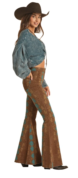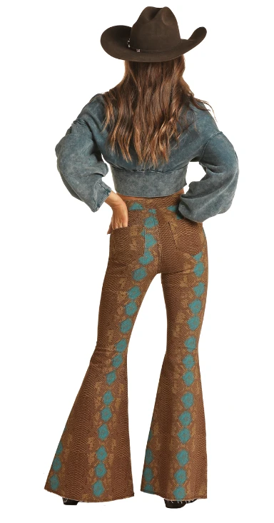 Women’s Rock & Roll RRWD7PRZR4 Snake Skin Button High Rise Bell Button Jeans