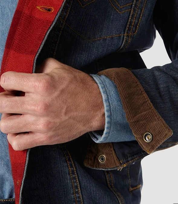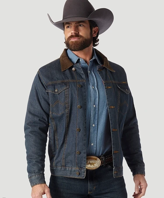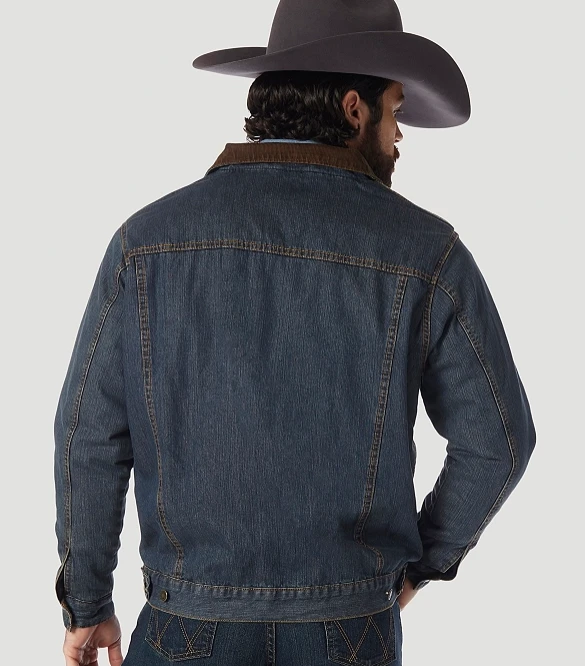 This transitional western styled jacket is both versatile and functional. Constructed in heavyweight, 14.75 oz. prewashed cotton denim and lined with warm and cozy blanket lining for durability and coziness. Features cool Wrangler® details like “w” stitching on the pockets and a Wrangler® logo. Fashions a stylish corduroy collar and lined cuffs, side pockets, front snap flap pockets, button front closure and adjustable buttons at the waist.